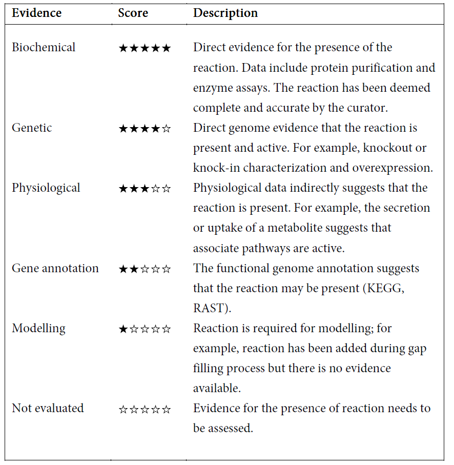 A confidence scoring procedure was proposed by Thiele and Palsson ( 2010) but has seldom been used for published metabolic reconstructions. Confidence scoring is important as it allows the curator and user of the model to assess rapidly whether reactions are likely to be true. This information is especially useful when encountering a discrepancy between model prediction and experimental data. It is likely that there are reactions present in the reconstruction that would not be observed in vivo under any environmental condition. Gene-based homology evidence does not imply that these genes are expressed and translated to functioning enzymes. Furthermore, the RAST, SEED and Pathway Tools annotation engines seek to resolve false negatives through pathway-level prediction, further contributing to the presence of false-positive reactions. Finally, it is likely that there are reactions in the reconstruction with incorrect cofactors, directionality and stoichiometry. Our reaction confidence scoring system is described by and adapted from one developed by Thiele & Palsson (2010).